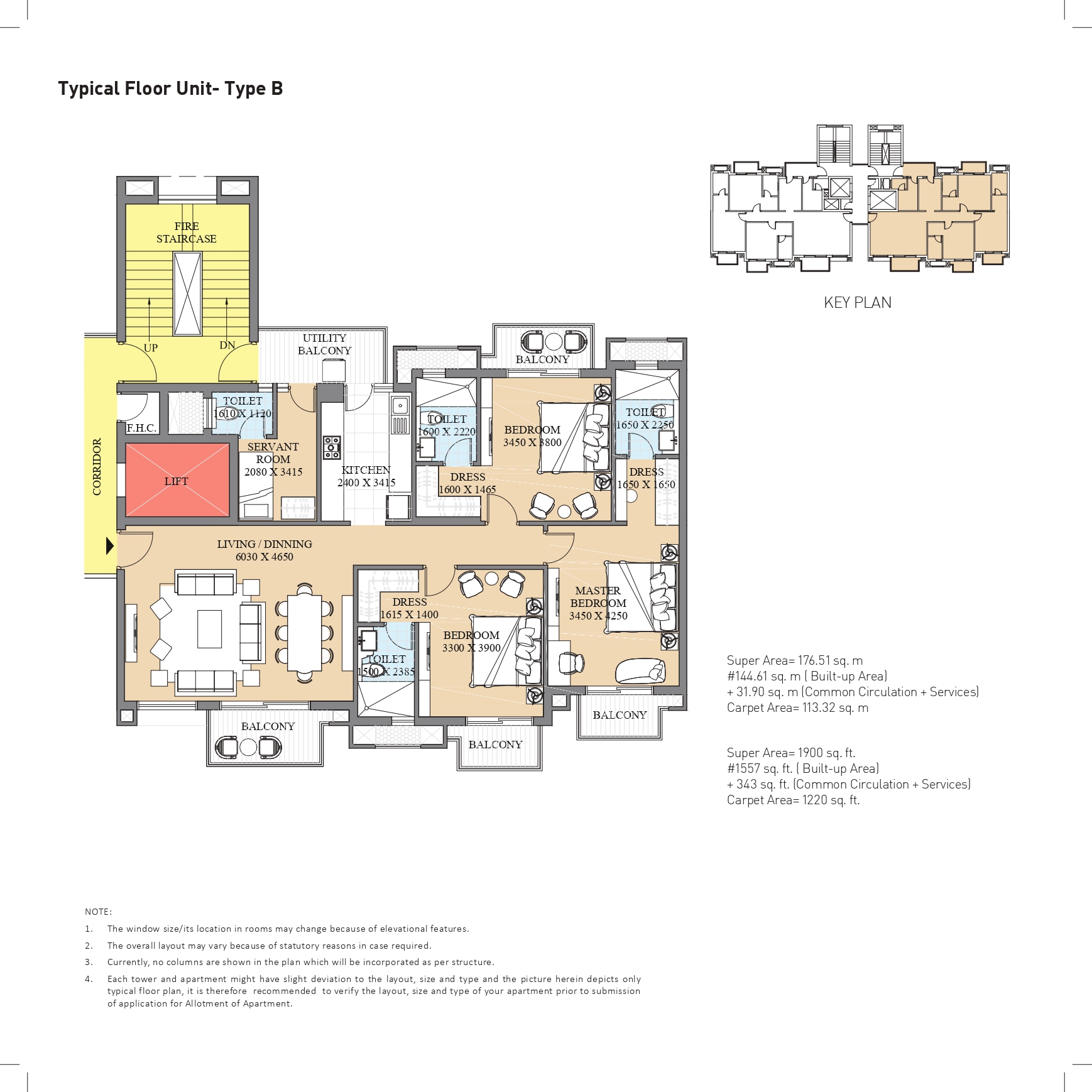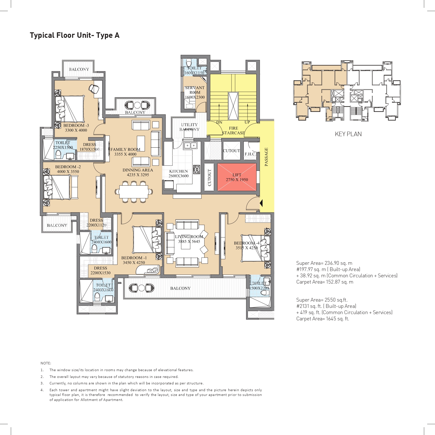 Vitrifi ed Tiles fl ooring in Living, Dining & Lobby; Wooden/ Vitrifi ed Tiles fl ooring in Bedrooms; Vitrifi ed Tiles in Kitchen. Ceramic Tiles in Utility, Servant Room and Toilets. Staircase & Landings to be in Marble/ Kota/ Terrazzo fl ooring. Balconies will be in Anti-skid Ceramic Flooring.